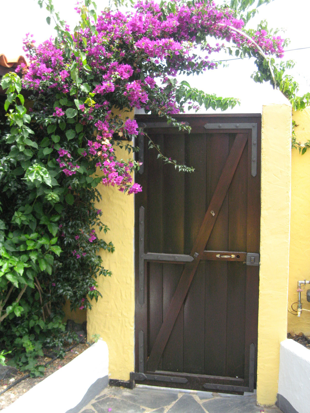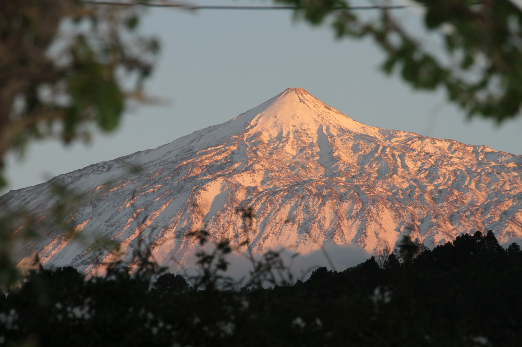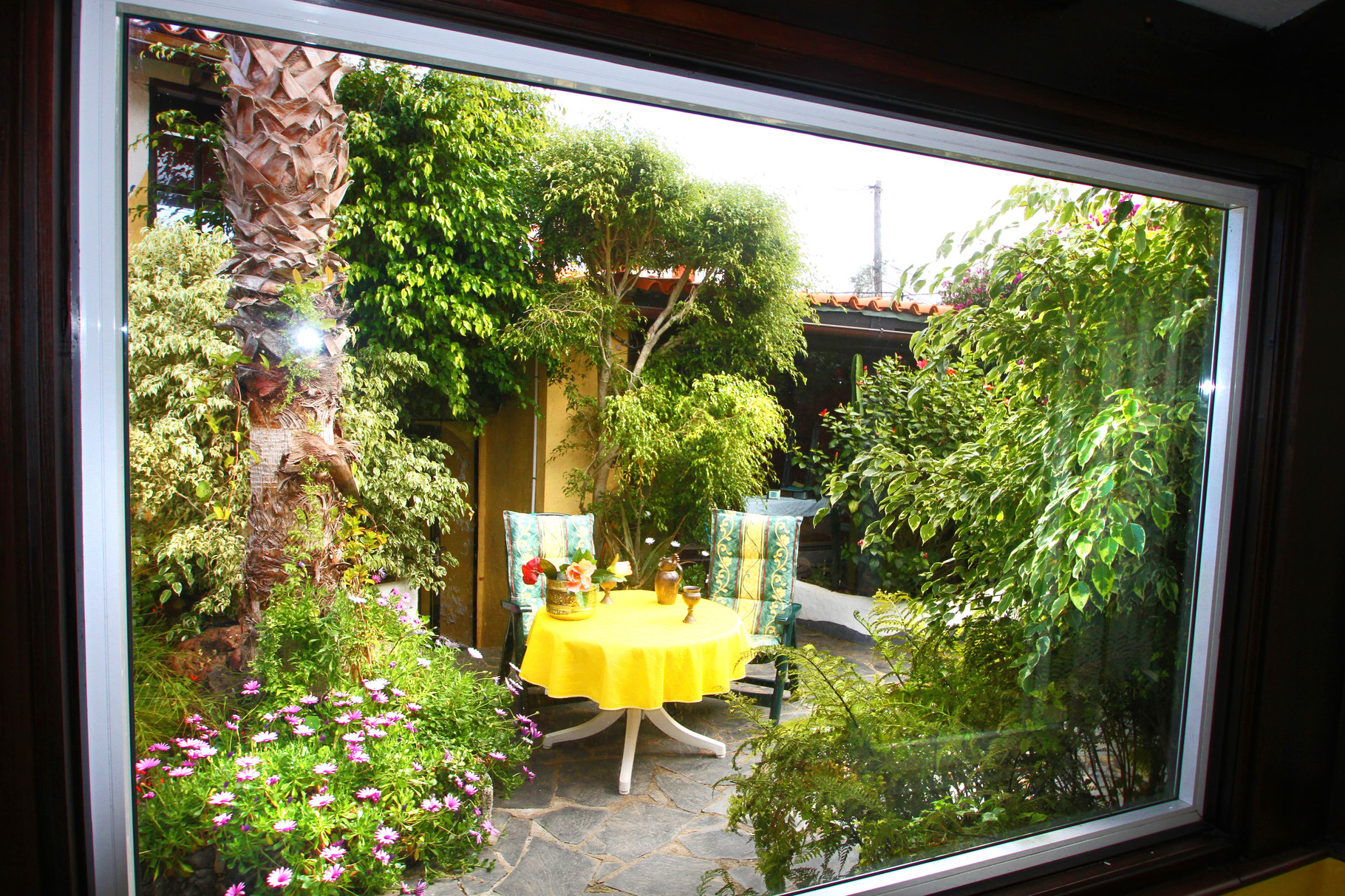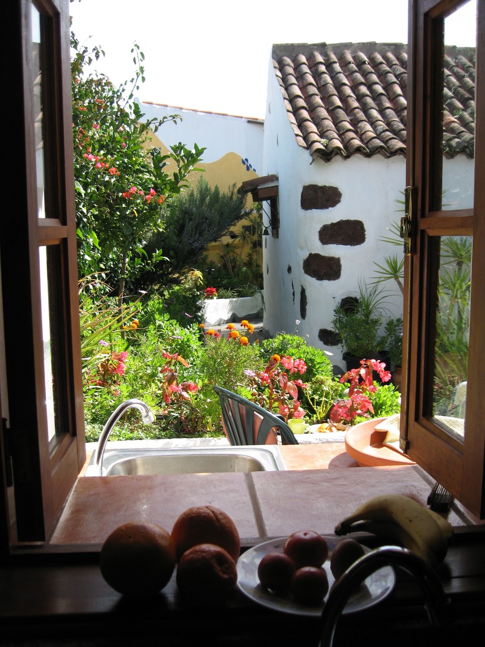 Mittelpunkt der Finca ist der Innenhof mit seiner Blütenpracht und Blick auf den Teide.